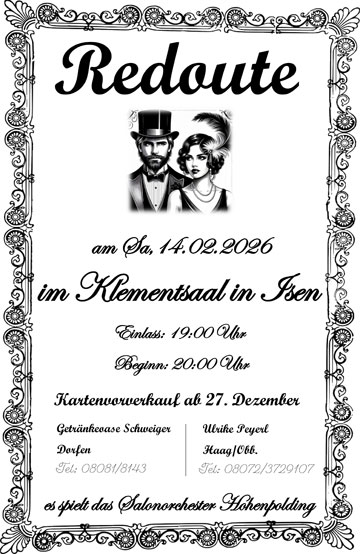 Tanzmeister auf Ihre Kosten. Zur "Heimkehr" der Dorfner Redoute in die historischen Gemäuer arrangierte Generalissimo Gerbl eigens Walzer des Türmermeisters Franz Xaver Berr aus Rosenheim und zieht wie so oft bestimmt noch so manche musikalische Überraschung aus dem Chapeauclaque.